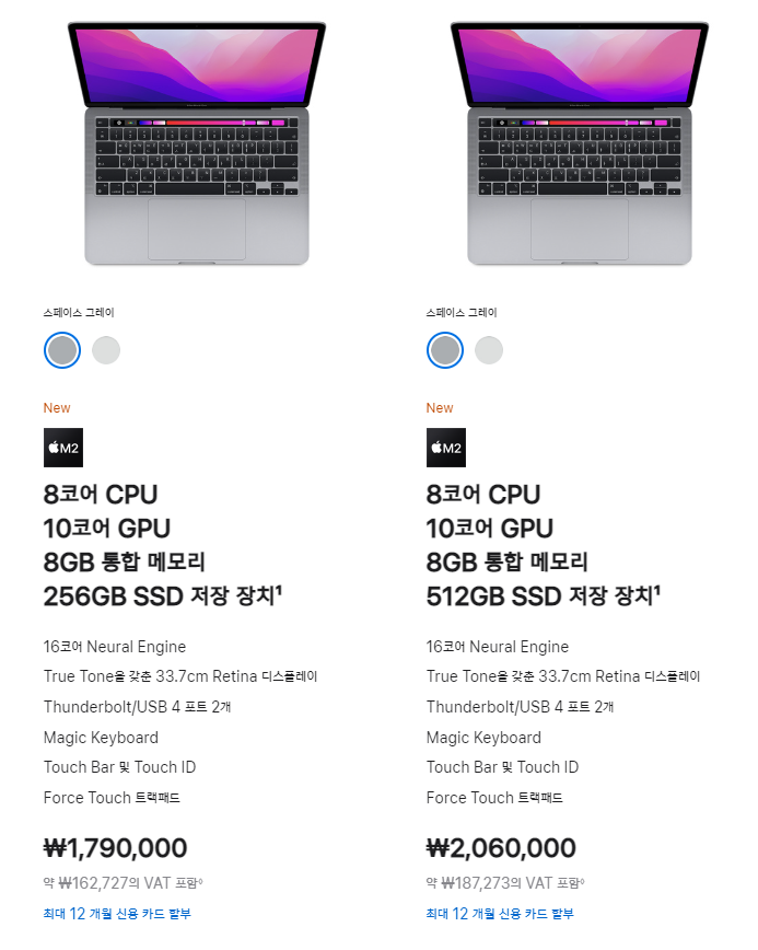 Apple 한국 홈페이지 기준 기본형 M2 MacBook Air와 10만원 차이 밖에 나지 않는 MacBook Pro 입니다.