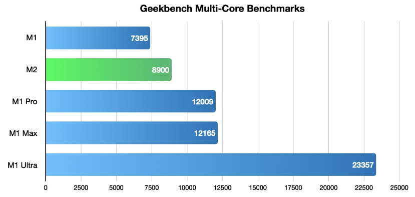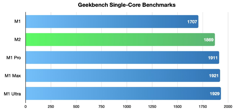 WWDC에서 언뜻 봤을 땐 M1 대비 큰 성능 향상이 없는 것 같았는데 벤치 점수를 그래프로 비교하고