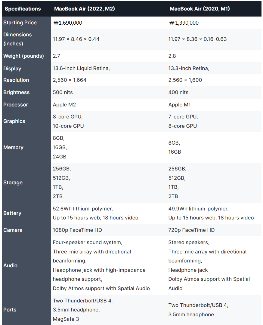[M1 vs. M2] 맥북 에어 M2 비교: 스펙