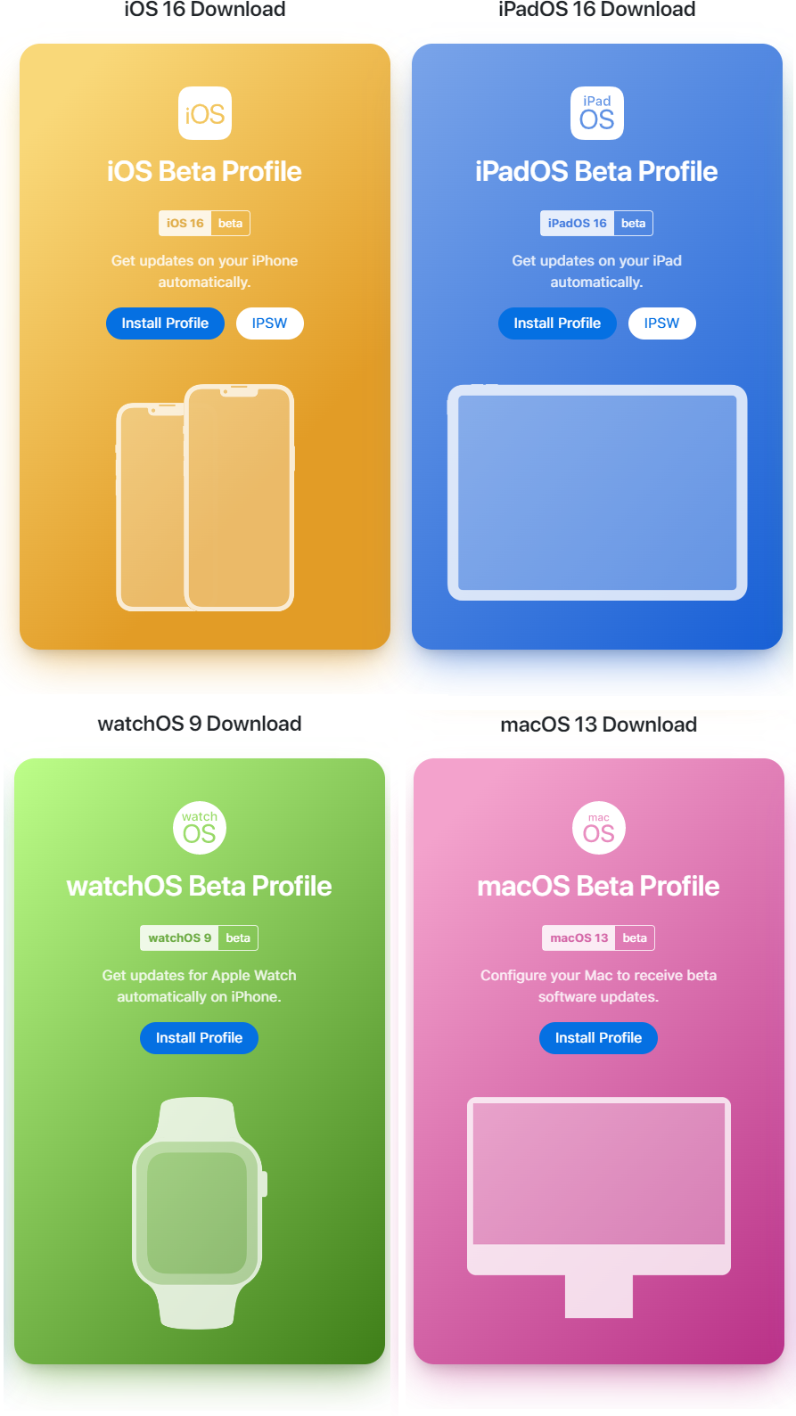 Download latest beta profiles for iOS, iPadOS, macOS, watchOS and tvOS.