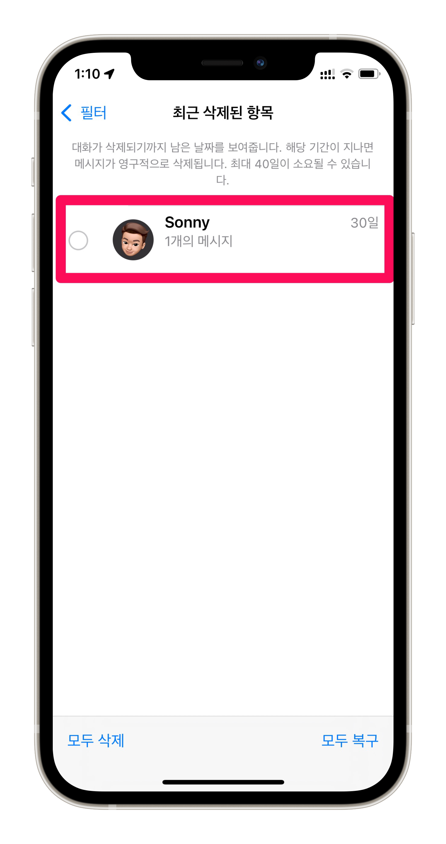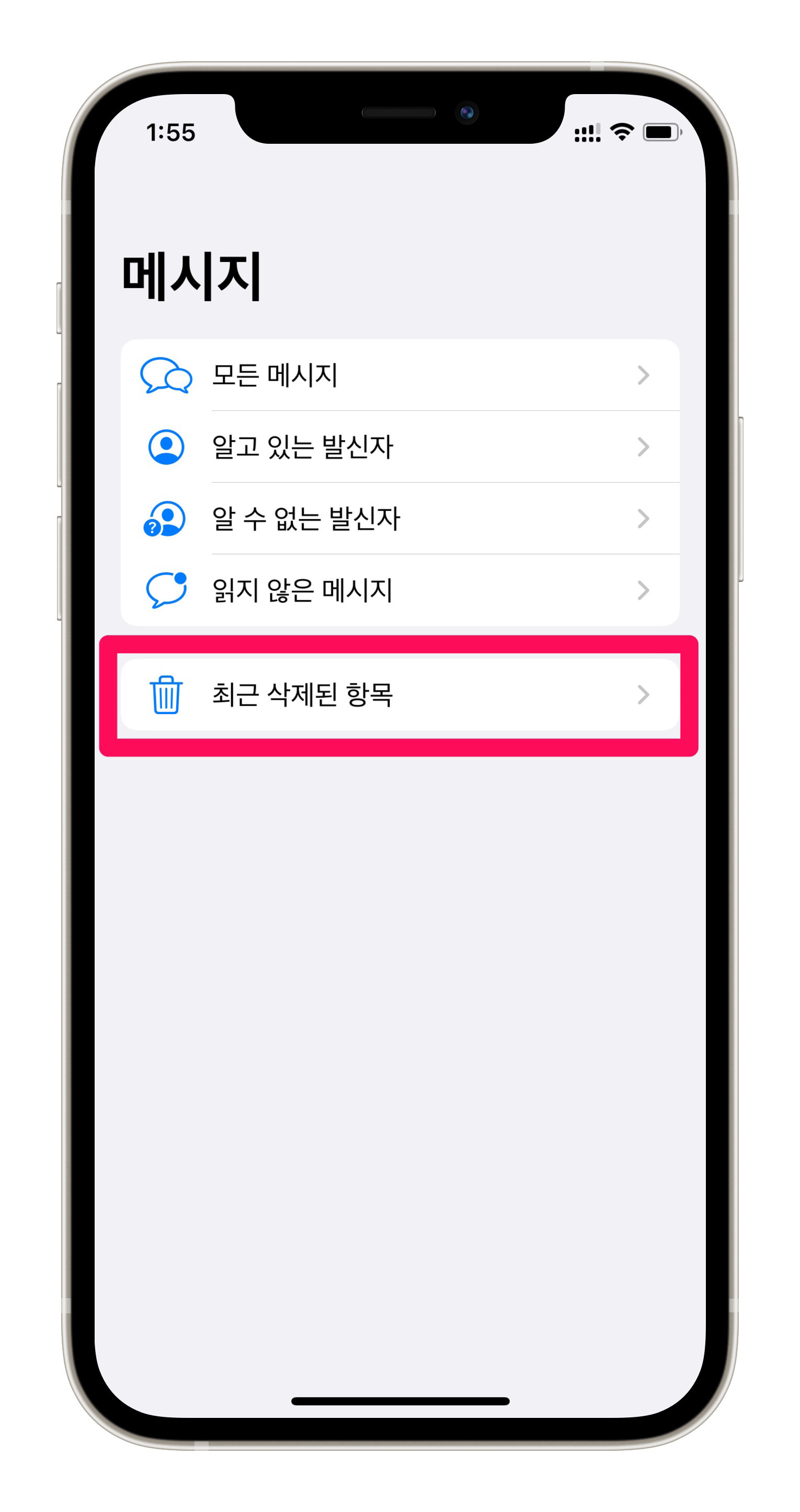 메시지 어플을 처음 실행했을 때 보이는 분류가 세분화 되었습니다. 특히 '최근 삭제된 항목' 분류가 새로 나타났고 최근 30일 이내에 삭제된 메시지를 보관하는 것으로 보입니다. 또 '읽지 않은 메시지' 분류도 생겼습니다.