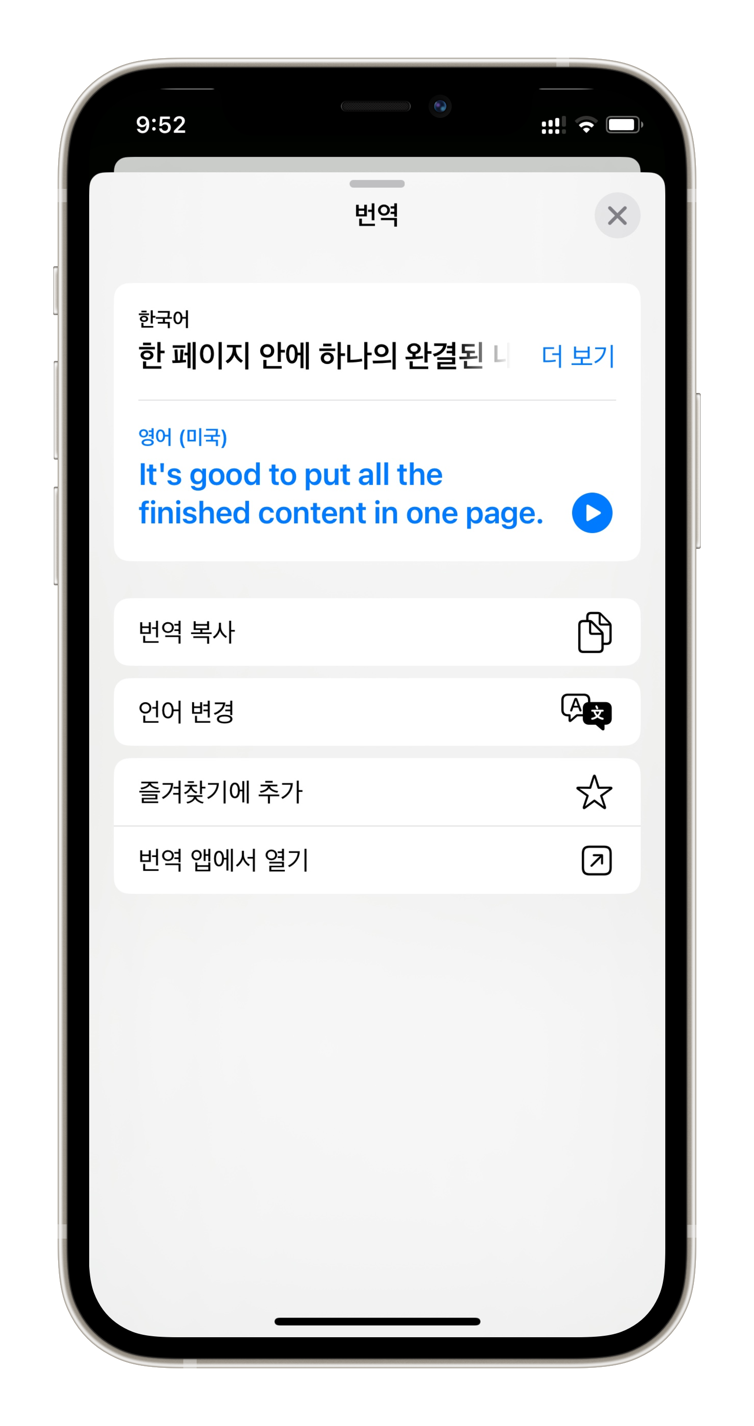 아이폰의 번역 어플이 구글 보다는 좀 어색하게 느껴져서 안썼었는데 요즘은 어떤지 잘 모르겠네요. 빠르고 간단하게 번역하기 편리해 보입니다.