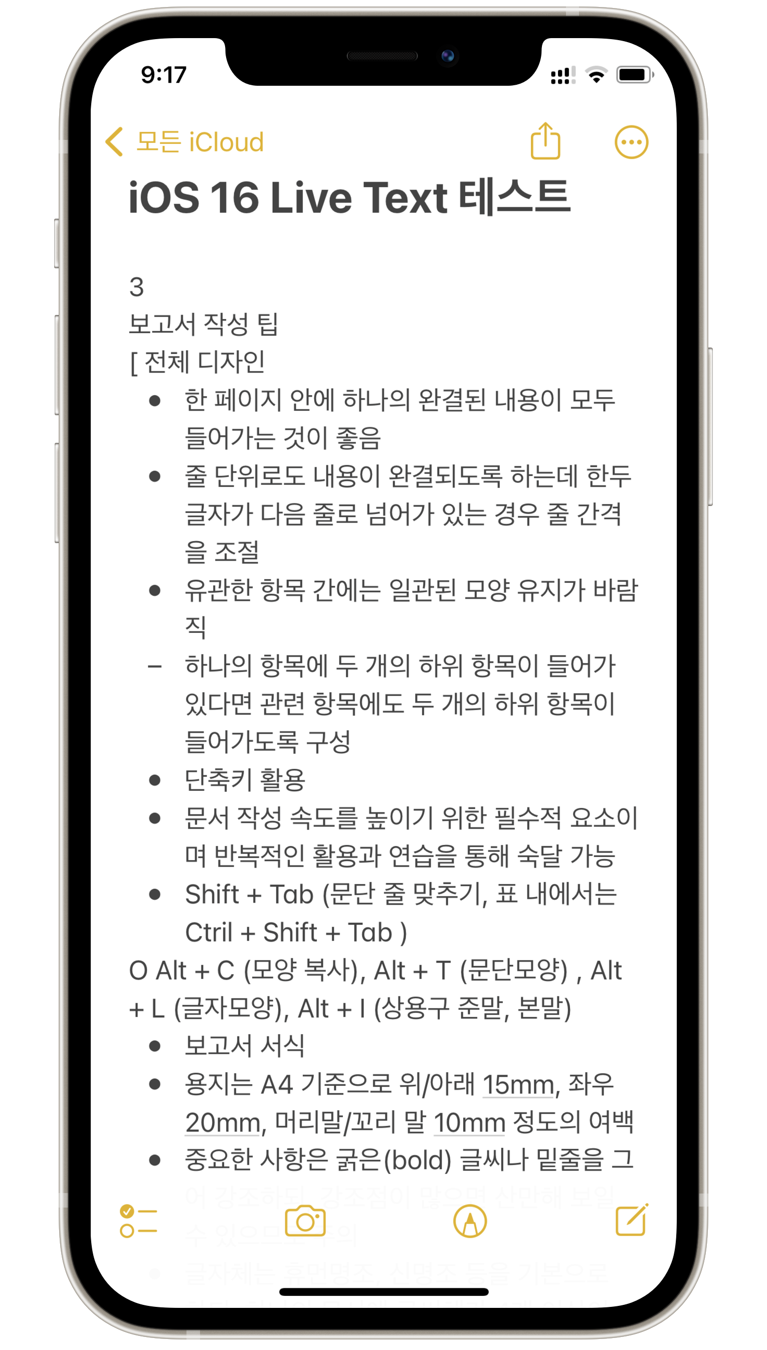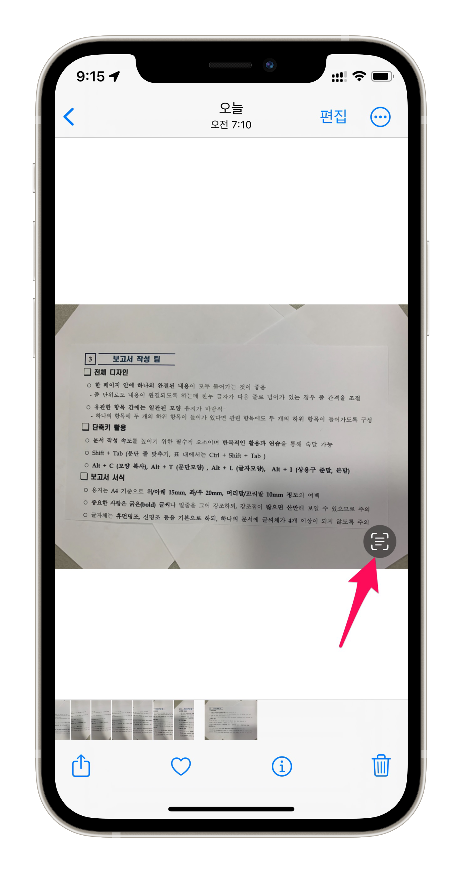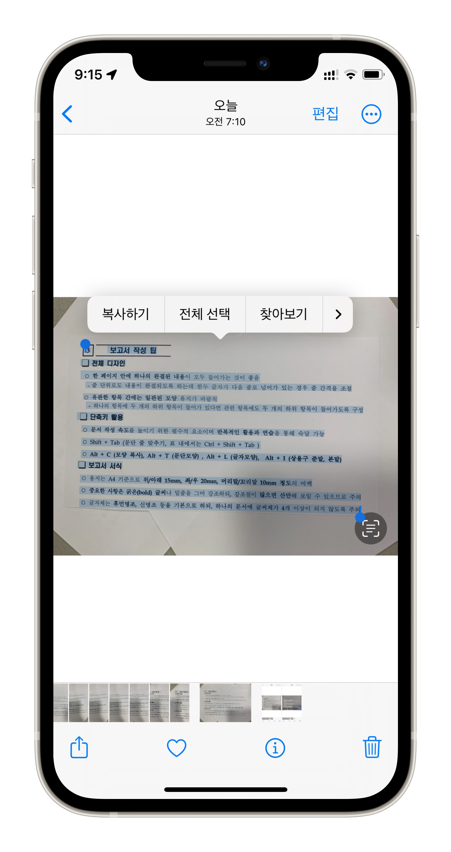 인터넷에서 '보고서' 검색한 결과를 출력해서 제 아이폰으로 찍어봤습니다. 예시는 사진을 인식했지만 동영상도 동작은 동일합니다. 인식하고 싶은 부분이 나오면 영상을 멈춰서 아래 방법으로 똑같이 진행하시면 됩니다.