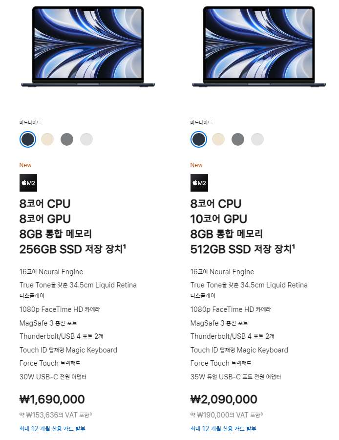 메모리만 추가해도 거의 200만원에 육박하는 가격이 문제인 맥북 에어 M2였습니다. 얼른 할인을 좀 해주면 좋겠는데요 ㅎㅎㅎ이번 맥북 에어 M2의 성능, 디자인, 스펙, 차이점에 대해 궁금하시면 지난 포스팅을 참조해주세요 :)