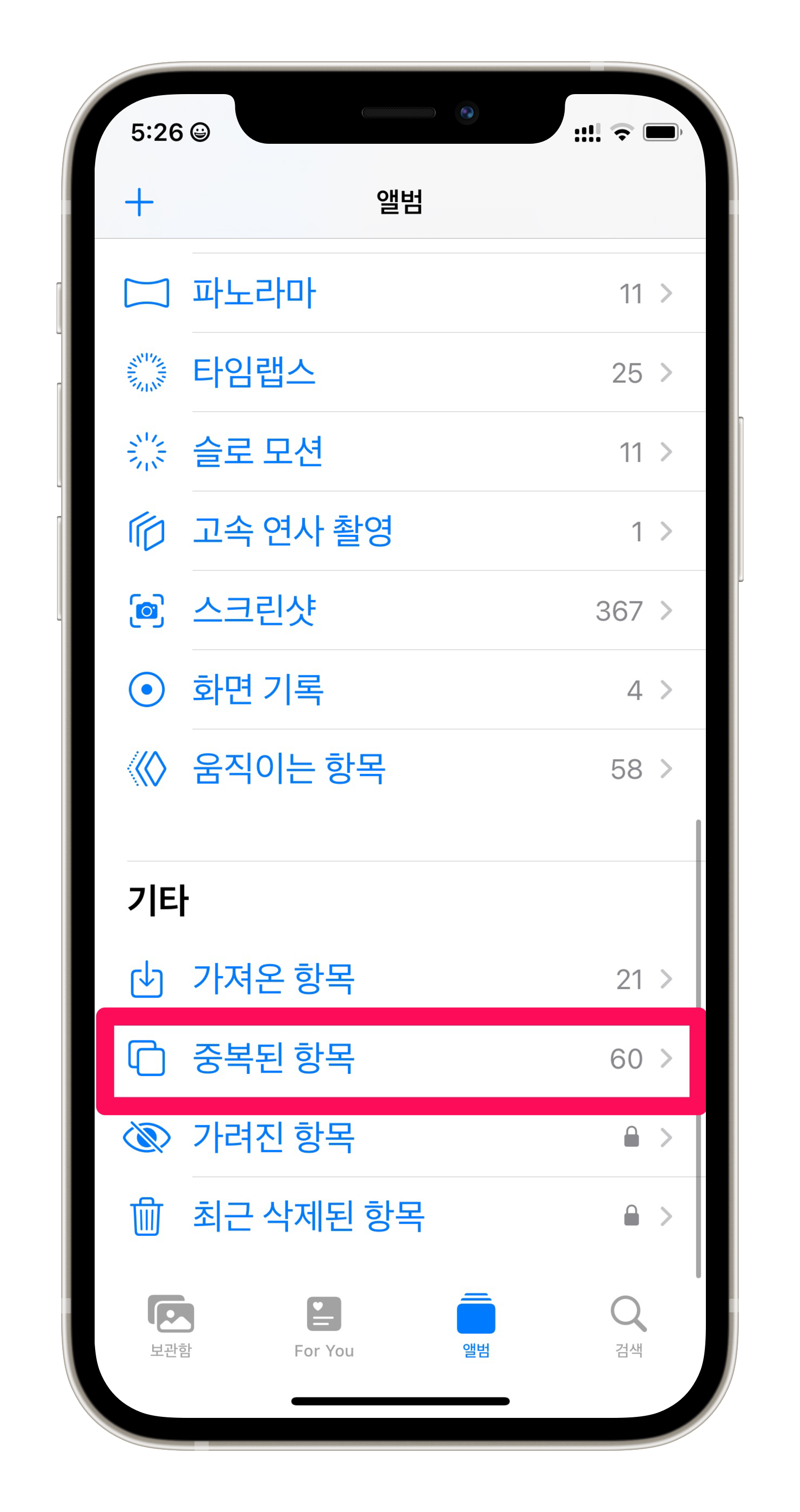 앨범 탭에서는 사진이 종류에 따라 자동 분류되는데 iOS 16에서는 '중복된 항목'이 추가되었습니다. 제 경우 60장의 사진이 중복되었다고 나오네요. 저는 다른 어플로 중복 사진을 정리해서인지 생각보다 많이 나오진 않았습니다.