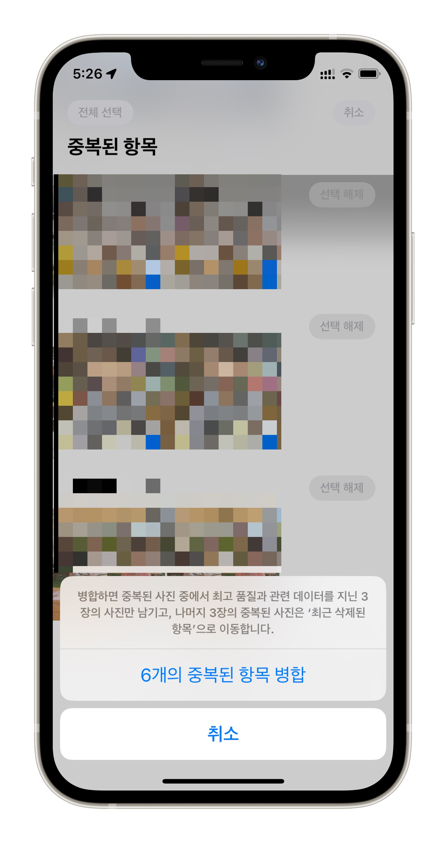 이제 찾은 중복된 사진들은 하나만 남기고 모두 지워야겠죠? 그런데 애플은 이 기능을 두고 병합(merge)라고 했는데요.